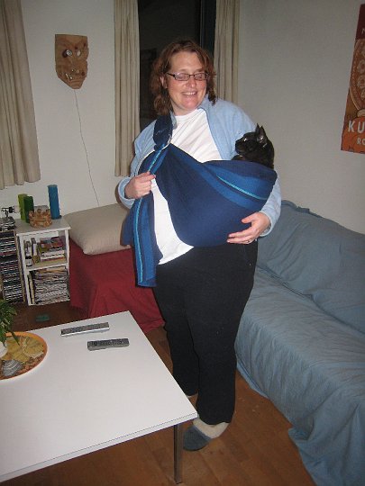 Until the baby actually gets here, the cats have been doing a good job standing in. Here’s Mackenzie helping me try out the new baby sling – bodes well for the kid that he didn’t want to get out! Of course, I don’t call him my stoner cat for nothing. And he weighs a lot more than the kid will for several months – 18.5 pounds (8.4 kg)!