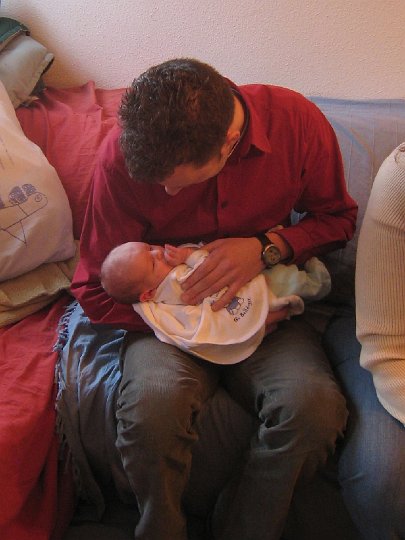 On the second visit from the midwife on Saturday, she also weighed and measured Liam – six days after his birth, he was down 200 grams from his birth weight of 3.508 kg (7 lbs 12 oz), which is fairly normal and no cause for worry. She also measured his length for the first time – for some reason the hospital here doesn’t do that. He was 53 cm (21 in). And all agree he’s a healthy little boy and that he’s quite alert and inquisitive for his age – though that’s more normal for a late baby. But from birth on he’s been quietly looking around and taking in all that happens around him.