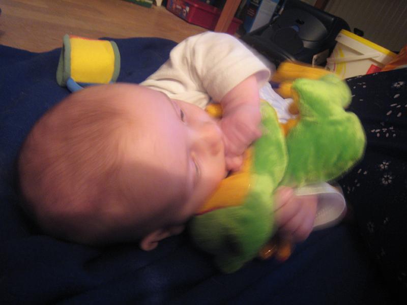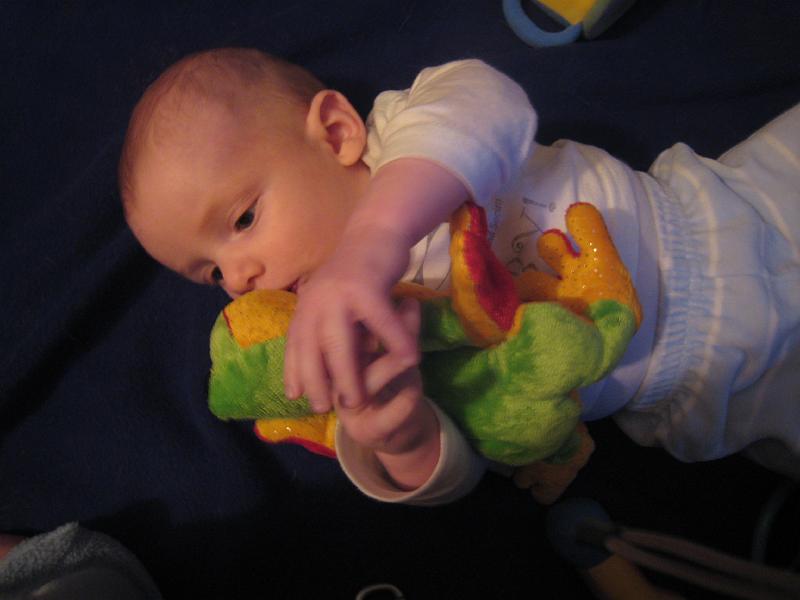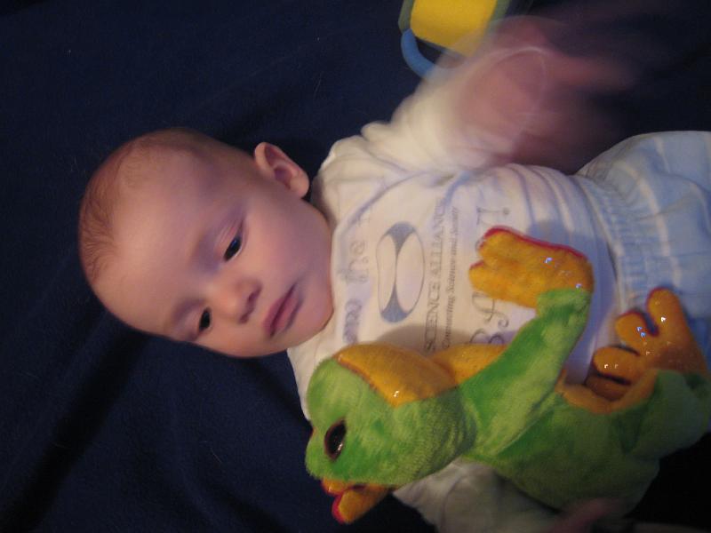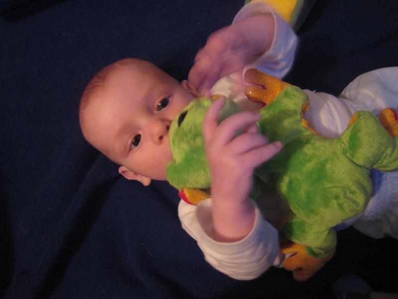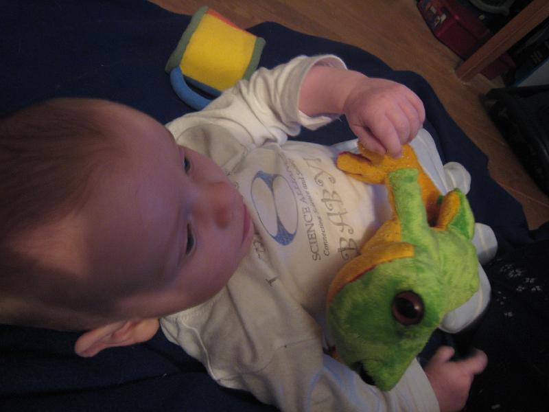 My sister Sumi sent a cute, cute froggie for Liam and he’s starting to pay attention to things like that – playtime with froggie: