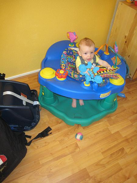 Liam loves playing in his Exersaucer, which Miranda was kind enough to pass on. They don’t have them here, so we brought it back on the plane taped together as a piece of luggage. Yes, we were the couple with way too much luggage at the airport – between what we brought, what we were given as gifts and hand-me-downs and what we bought (clothes, English kids books, maple syrup, etc), we were at the max or even somewhat over the limit, but luckily the KLM gate agent let it on. But it’s wonderful for Liam since he really likes standing and being able to see everything and chewing on things.