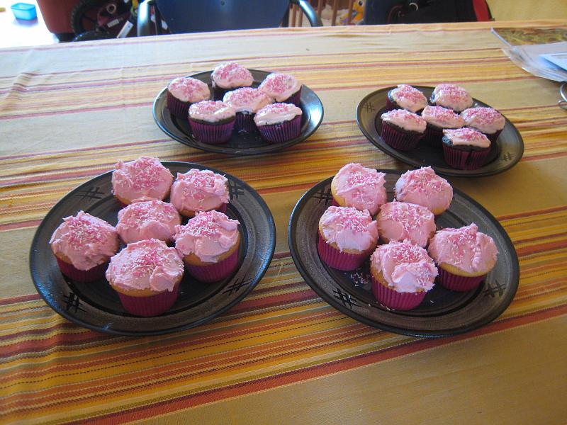 And because the mix made 12 cupcakes but 24 papers were provided, I whipped up a batch of wacky cake (no, not space cake, wacky cake) to fill up the rest and dyed some leftover cream cheese icing I had to make some more pink cupcakes, which gave us 24 yummy cupcakes.