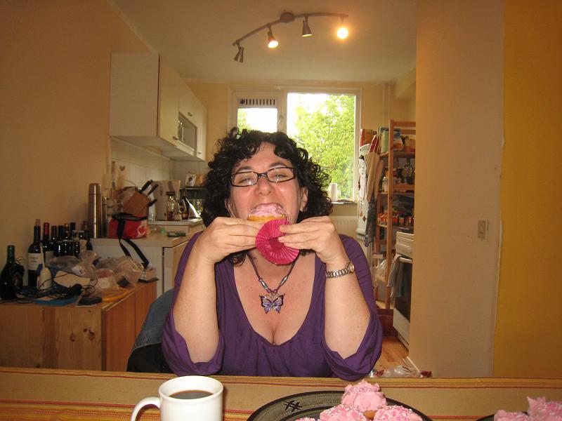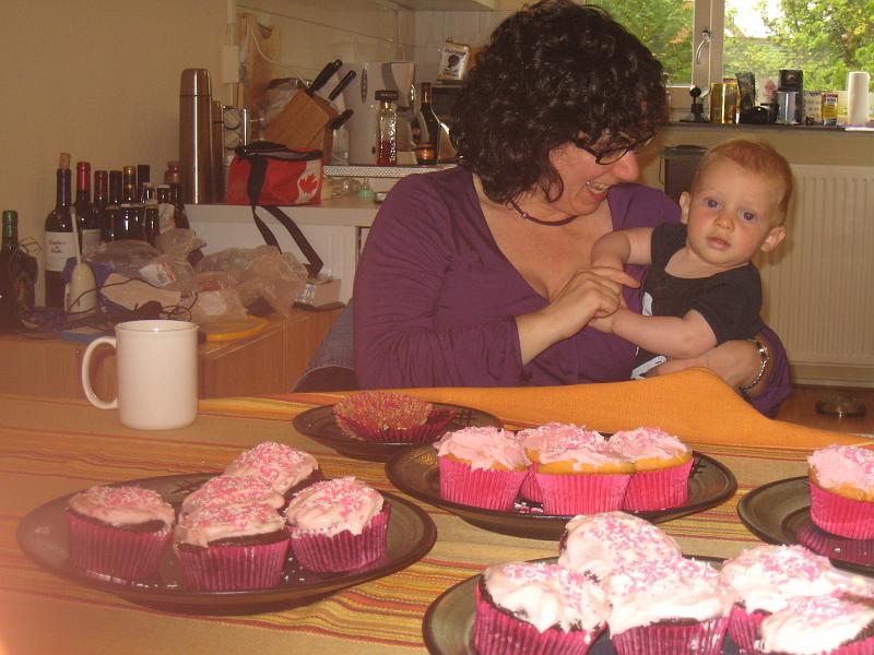 A while back, a friend of bg’s and mine in Australia sent us a cupcake mix (complete with papers and icing) after bg had complained about the lack of cupcakes in this country. So, today, bg came over and we made them. Cooking is always interesting with my leg barnacle/kitchen destroyer.