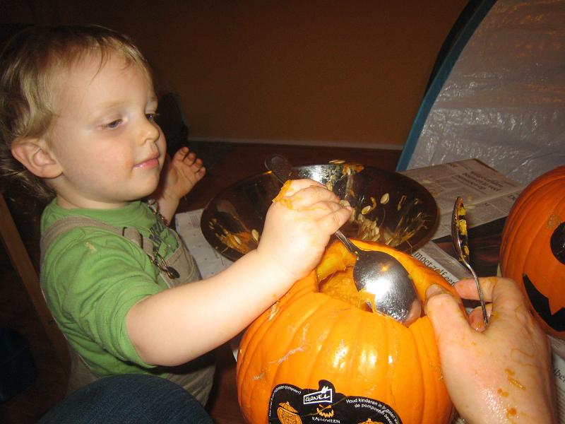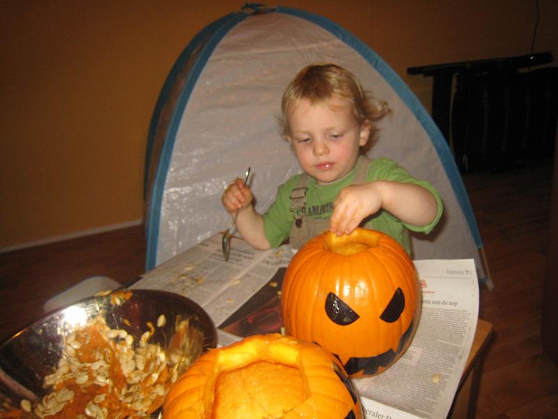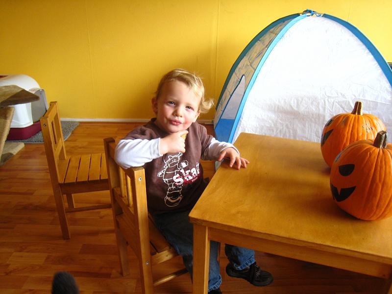 Even though I didn’t put them out since it’s not done here, I decided to carve up the pumpkins this year and get Liam to help me to get a start on maintaining the tradition.