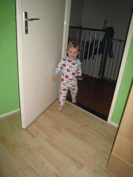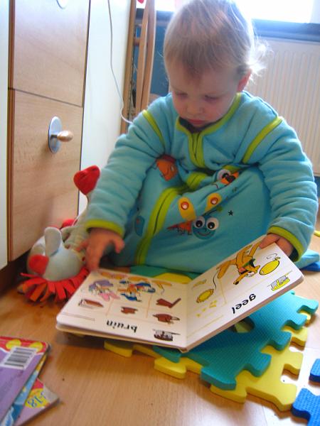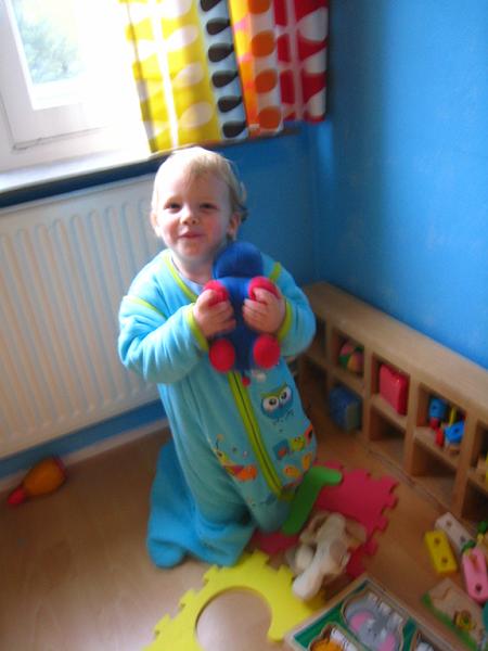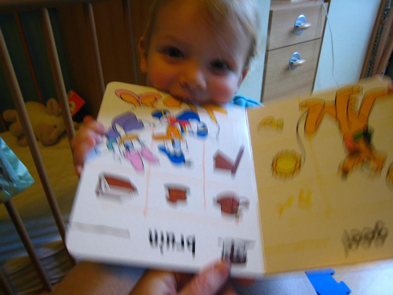 Playing in his room in the morning. Liam doesn’t like to get out of his sleep sack for a bit, preferring to waddle around for a bit and bring me books and things to read to him.