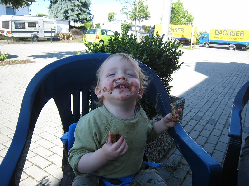 | Liam eating breakfast Saturday morning, bread with chocolate hazelnut spread, at the Formula 1 motel between Mannheim and Heidelburg. That little travel chair is great! |