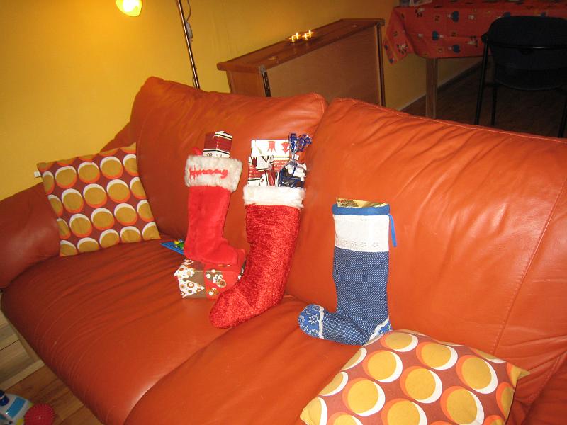 The stockings were hung by the chimney with care... Oh, wait, make that, placed on the couch.
