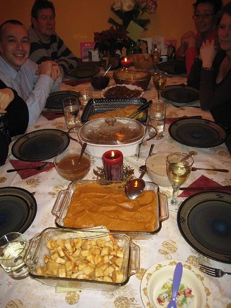 Dinner: Honey Roasted Parsnips, Whipped Sweet Potatoes, Stuffing, Chestnut Feast (chestnut loaf topped with a mushroom ragout and wrapped in puff pastry), Green Bean Cassarole, and of course gravy (mushroom and "regular") and cranberry sauce. There was pumpkin pie and mock mince meat tarts for dessert.