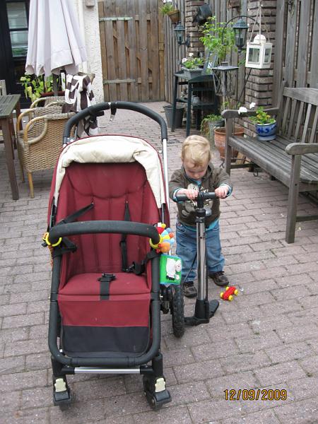 After we leave on Saturday morning. Liam helps to pump up the Bugaboo tires.