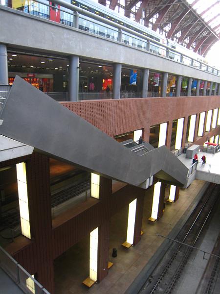 Three levels of trains, with a row of shops sandwiched between the 2nd and 3rd.