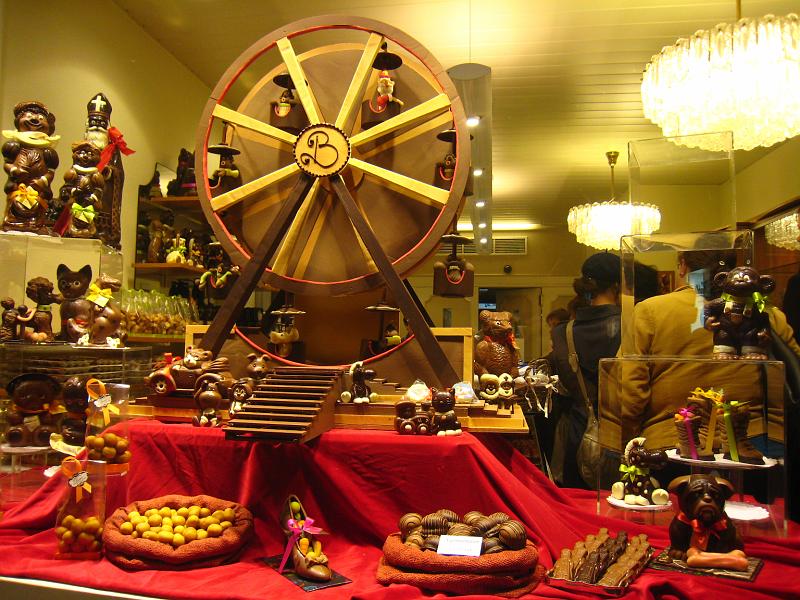 | Belgian chocolate shop - mmm good. The carosel is filled with a chocolate Sinterklaas and Zwarte Pieten. |