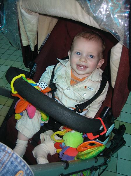 | Liam seems to be no worse for the wear after taking a nap under his rain cover. (m) |