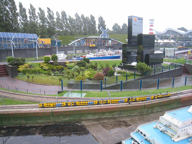 | A train (it moves and stops at stations and everything!), with the tallest building in the Netherlands behind. |