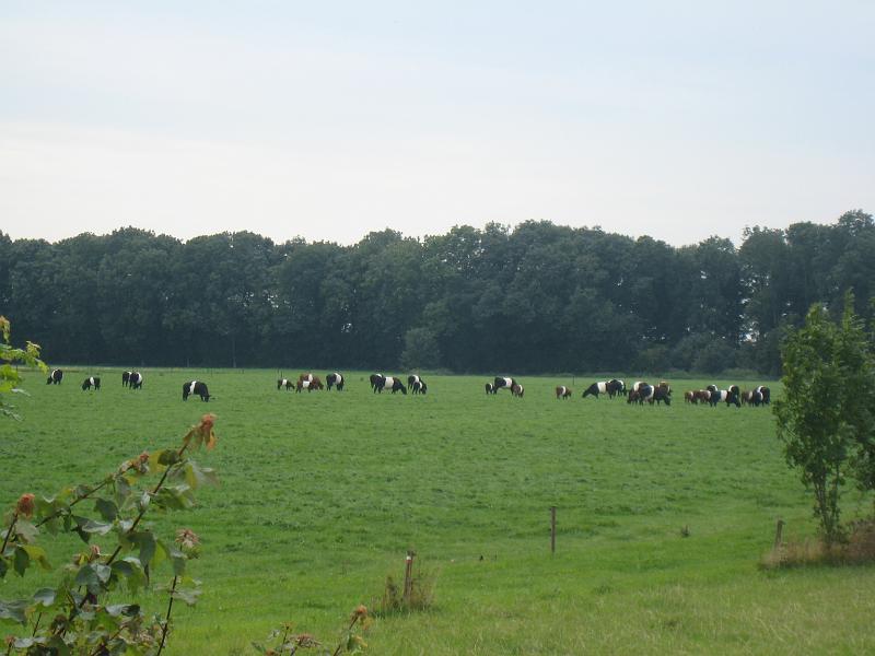 | The first thing we see is cows - a bit funny looking. Apparently an old breed called lakenvelders because they look like they're covered with white blankets (lak is blanket in Dutch). |