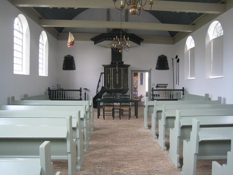 Inside the church, one of the few remaining original buildings. While the land was being reclaimed it was used as a horse stable, but it's been restored, including the hanging of a tiny ship near the altar as the islanders used to do.