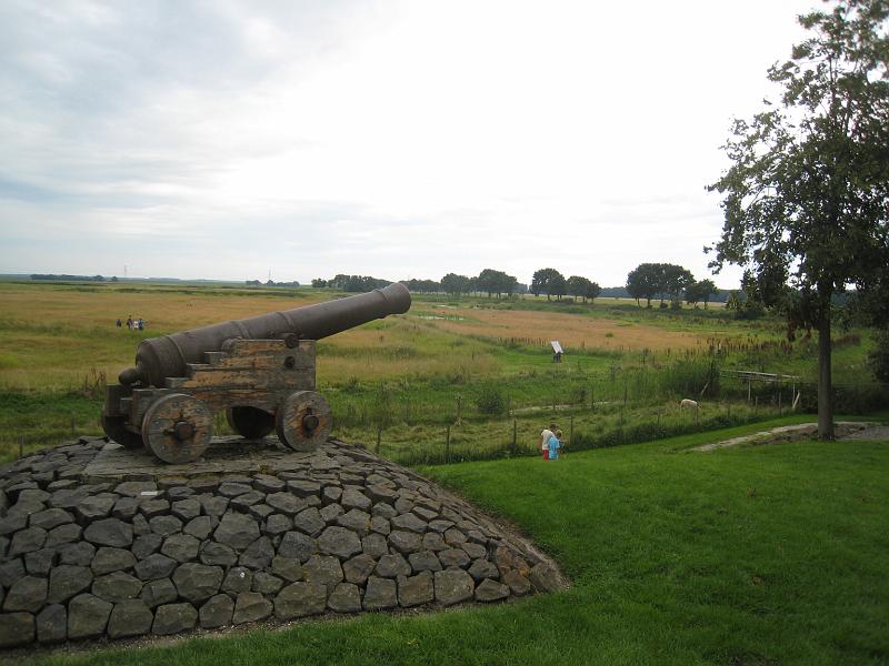 | A cannon. The low grassy area was all water - the trees mark the edge fo the old island. |
