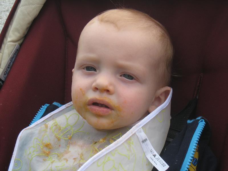 | Feeding Liam lunch. He's less than thrilled about this potje (jar of prepared baby food). |