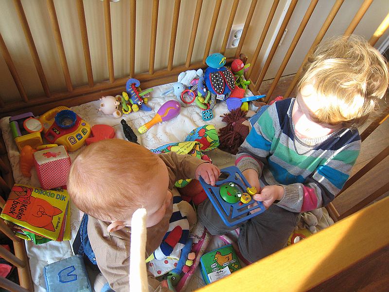 Looking at this picture, you'd think they play nicely together. Not usually. Liam is jealous of whatever Kaya gets, and Kaya is a typical baby, doesn't see things like ownership as important, just wants to get into everything. But they do like each other. | 11/28/10 12:55 PM