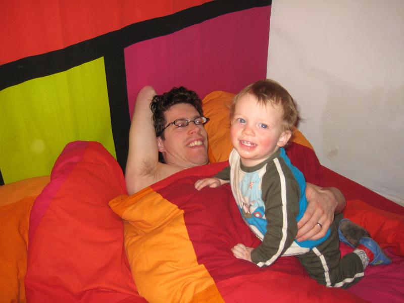 | Saturday morning in the apartment. Liam is very happy to wake up Papa. |