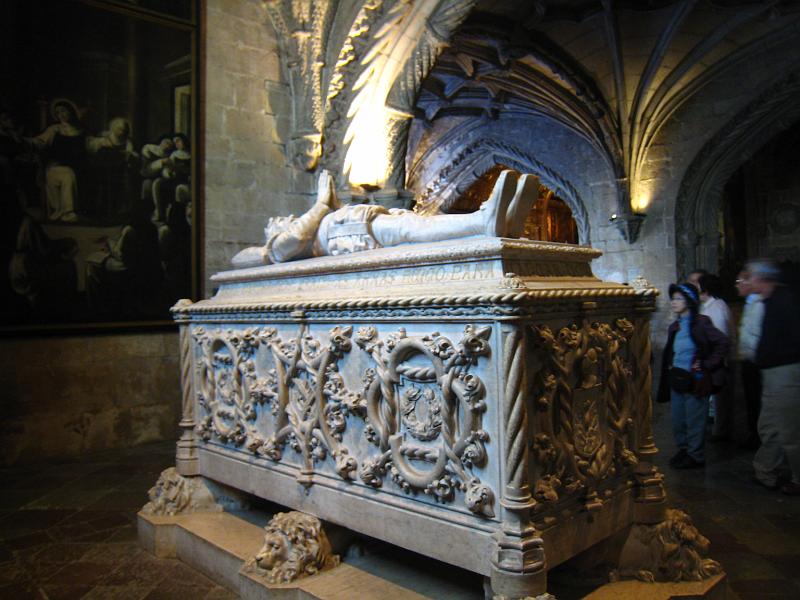 The two tombs ensconsed by the entrance are Luís vas de Camões (1524/5-1580), "One of the greatest Portuguese poets, author of the maritime epic Os Lusíadas, an account of the exploits of the Portuguese navigators, particularly of Vasco de Gama, and the history of the Portuguese people."
