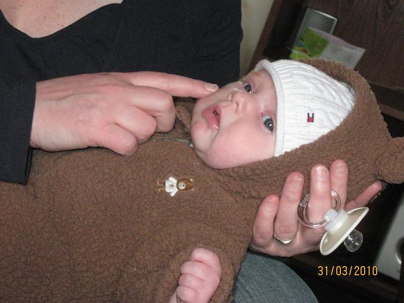 | Kaya in her soon to be outgrown bear suit - not so happy. | 3/31/10 11:50 AM |