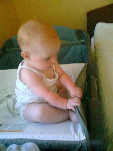 | She can now sit unaided - this is in the changing mat of a camping bed at our friends' house in Amersfoort, where we stayed for three weeks while they were on vacation. | 6/25/10 8:04 PM |